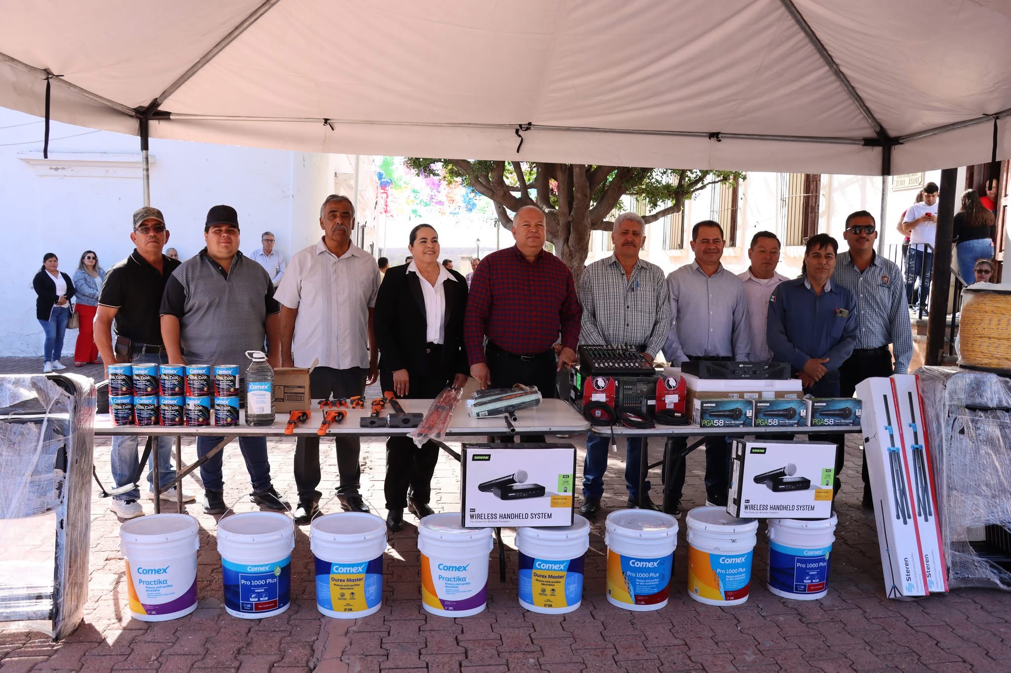 Entre los materiales entregados se incluyen cubetas de pintura, destinadas al embellecimiento de edificios públicos y bibliotecas, así como a la creación de murales en la cabecera municipal y diversas sindicaturas. Además, se proporcionó una carpa de 6×6 metros, junto con un equipo de audio que comprende un amplificador, una mezcladora de sonidos, micrófonos y cables, lo que facilitará la realización de eventos en las comunidades.