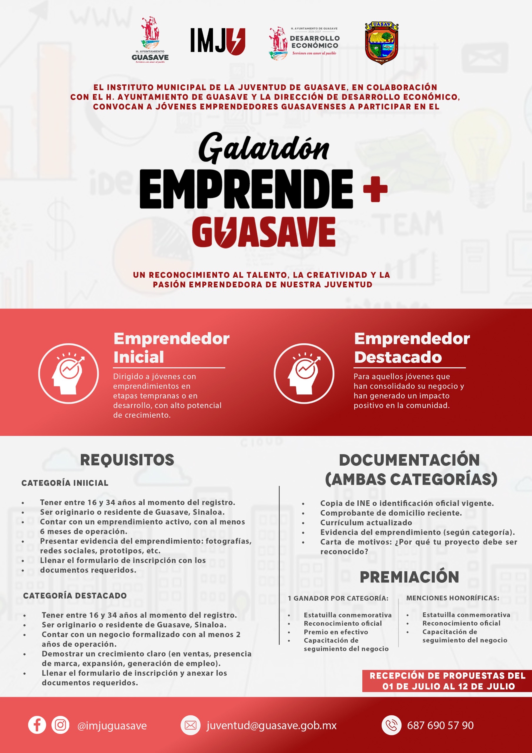 El Instituto Municipal de la Juventud de Guasave, en colaboración con el H. Ayuntamiento de Guasave y la Dirección de Desarrollo Económico, anuncia el lanzamiento oficial de la convocatoria “Galardón Emprende+ Guasave”, una iniciativa que tiene como objetivo reconocer, visibilizar y respaldar a los jóvenes emprendedores del municipio.