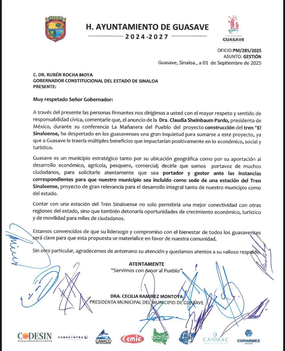 En el documento entregado al gobernador, se subraya que contar con una estación en Guasave no solo mejoraría la conectividad con otras regiones del estado, sino que detonaría oportunidades de crecimiento económico, turístico y de movilidad para miles de ciudadanos.