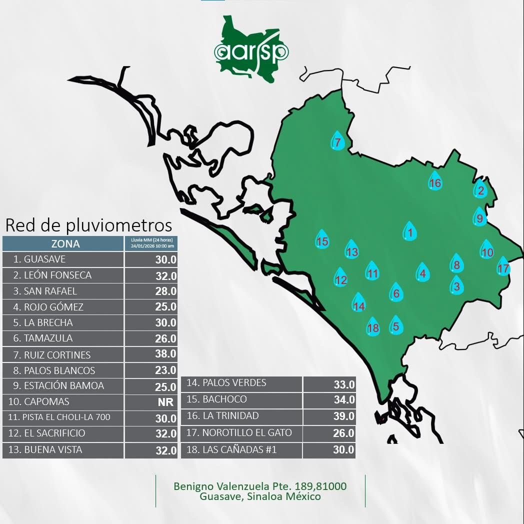 La Asociación de Agricultores del Río Sinaloa Poniente (AARSP), informó que, de acuerdo con datos de su red de pluviómetros, se registraron importantes acumulados de lluvia en el municipio de Guasave durante las últimas 24 horas, con mediciones que en varios puntos superaron los 30 milímetros.