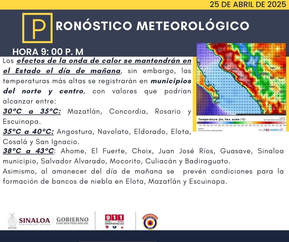 38°C a 43°C: Ahome, El Fuerte, Choix, Juan José Ríos, Guasave, Sinaloa municipio, Salvador Alvarado, Mocorito, Culiacán y Badiraguato.